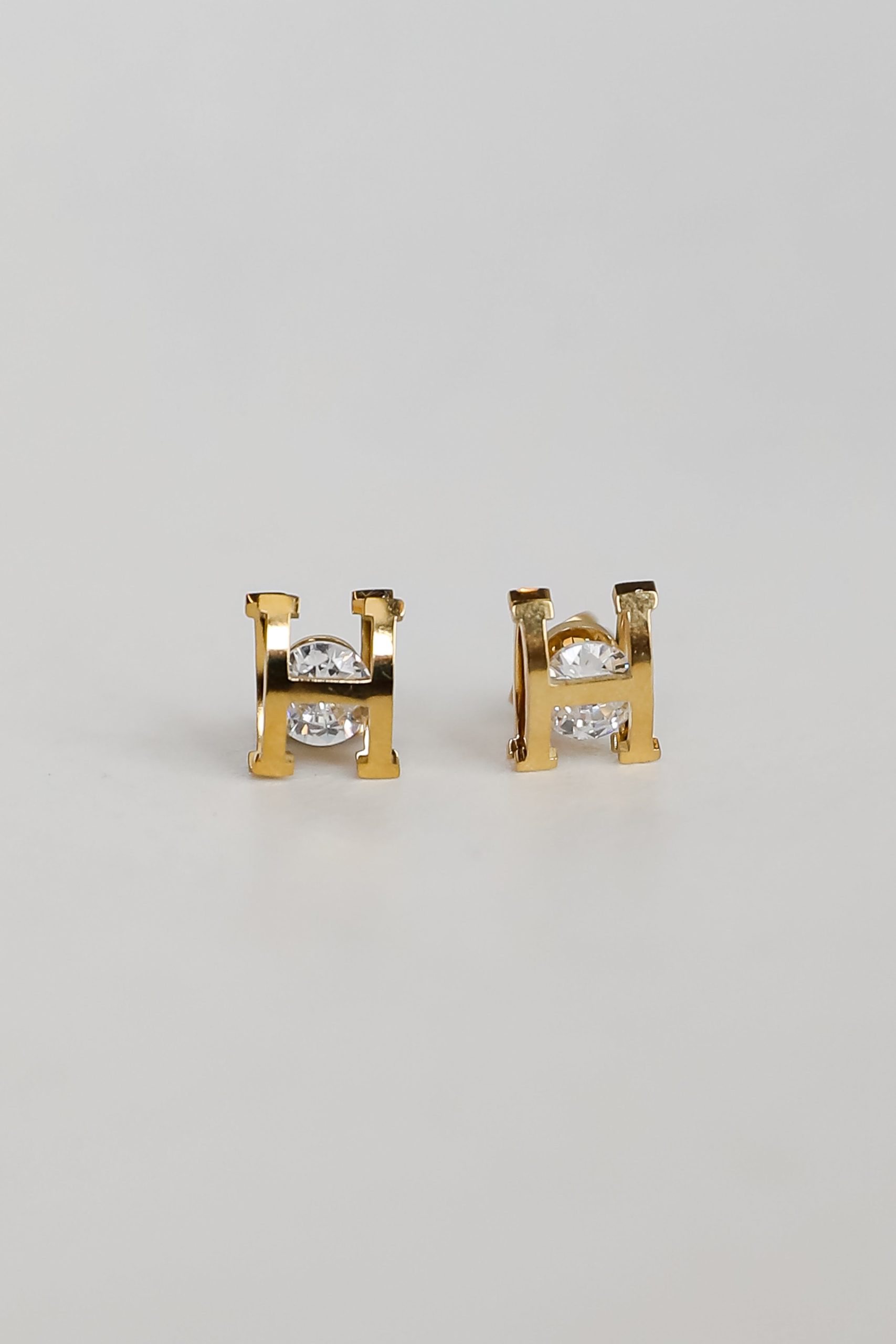 You’ll be seriously glowing every time you add the Hayley Gold “H” Rhinestone Stud Earrings to your favorite everyday looks! These dainty earrings feature a rhinestone center with the letter H and a stud post back! Style the Hayley Earrings with a mini dress + heels for a girly look! Gold Plated Rhinestones Stud Post BackOne Size | Length 0.5”
